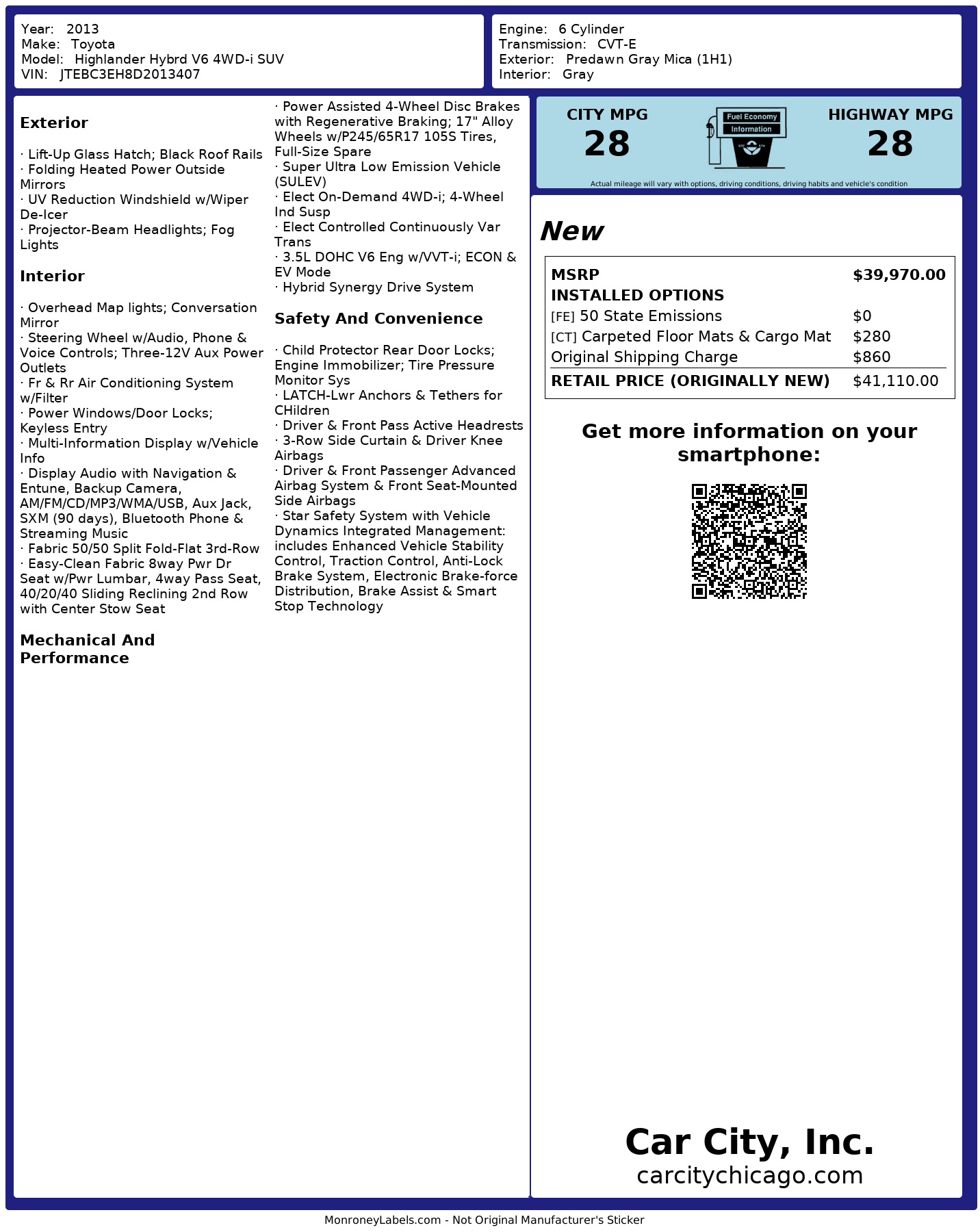 Prices exclude tax, title, license, documentation fees, and optional accessories. Vehicle availability and pricing subject to change. Contact Car City Inc. for complete details.