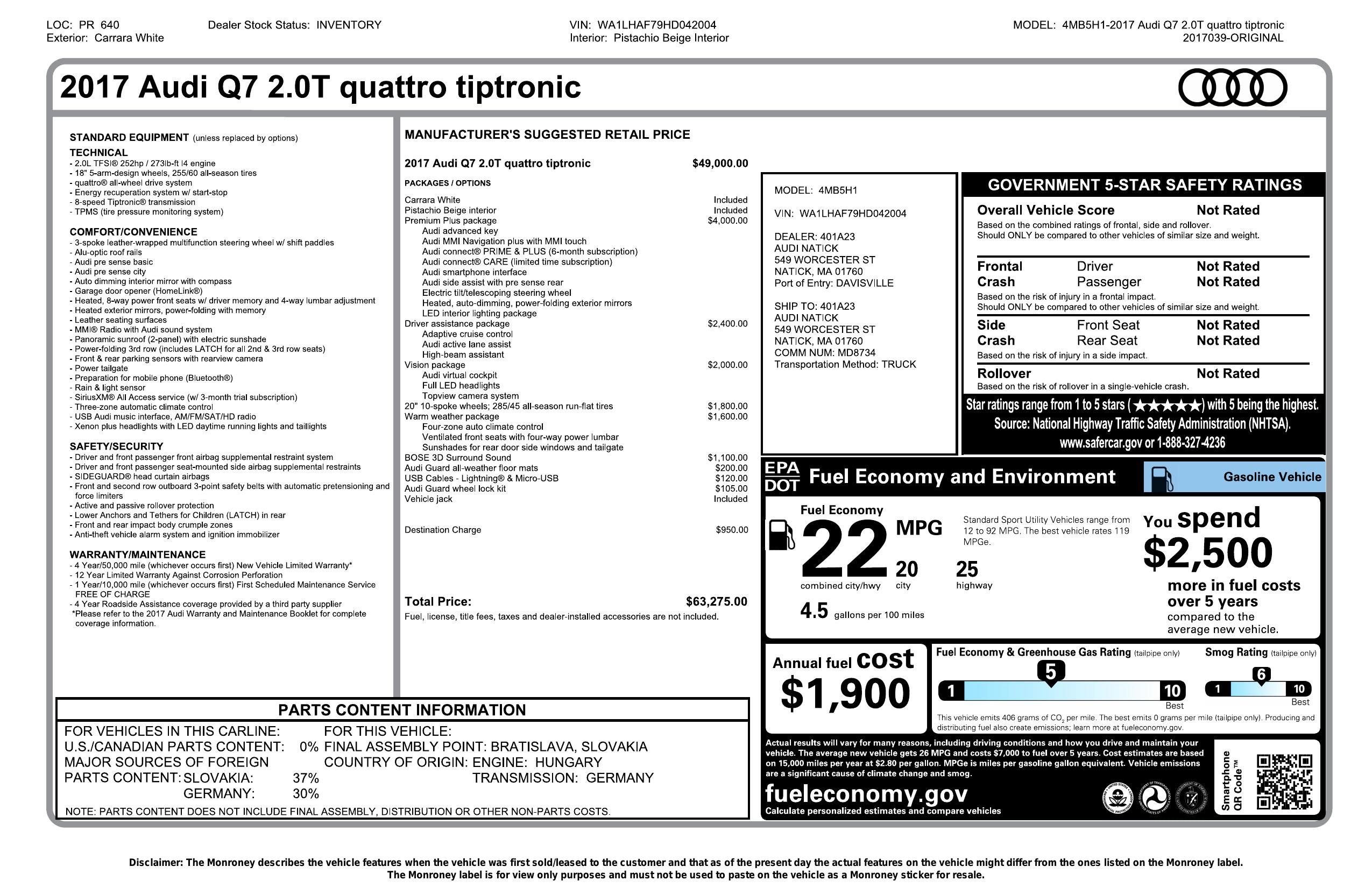 This 2017 Audi Q7 2.0T quattro is a Premium Plus package SUV finished in Carrara White with a Pistachio Beige interior. The Q7 is one of Audi’s best luxury SUVs, offering a smooth ride, strong fuel economy for the class, and the versatility of a third-row seat. This one is equipped with the right options including the Driver Assistance Package, Vision Package, Cold Weather Package, and Bose premium sound.